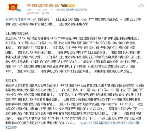 值得一提的是,这还只是篮协放的部分“具有代表性”的错、漏判罚,并不意味着这场比赛就没有其他的吹罚错误。说实话,如果不是广东宏远老总朱芳雨在球队赢了比赛之后,对迪亚洛伤害自家年轻球员陈家政感到极为不满,依然坚持上诉,篮协还真不一定对这场比赛进行如此详细的复盘和调查。